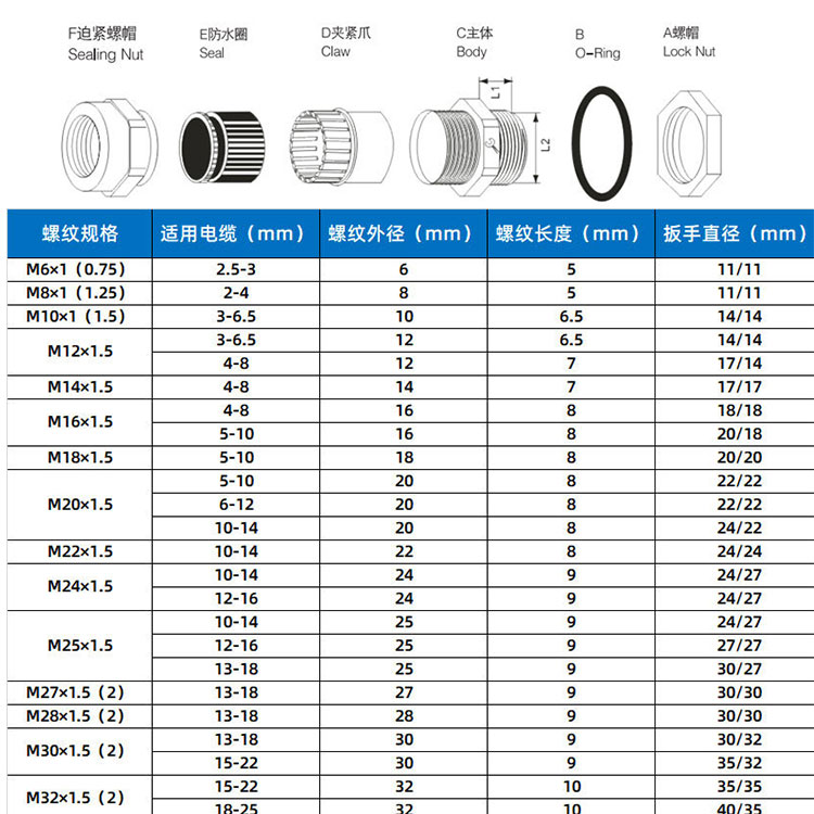 特殊夹紧爪与夹紧圈凹凸相扣设计,配合迫紧头装配省时便利,夹紧电缆范围大、抗拉力强、可防水、防尘、抗盐、耐酸碱、酒精、油脂及一般溶剂。